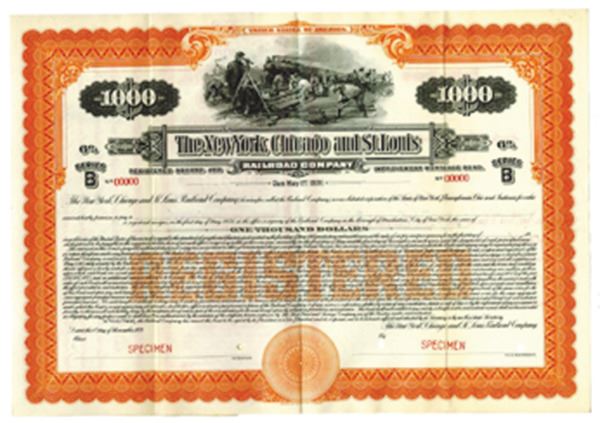 New York, Pennsylvania, Ohio & Indiana. $1000 Specimen 6% Series B Registered 2nd Improvement Mortgage Bond, Black print on orange border and under tint on horizontal format, Men repairing tracks at top with an oncoming locomotive in background, Specimen overprints and POC's, VF-XF condition, ABNC.