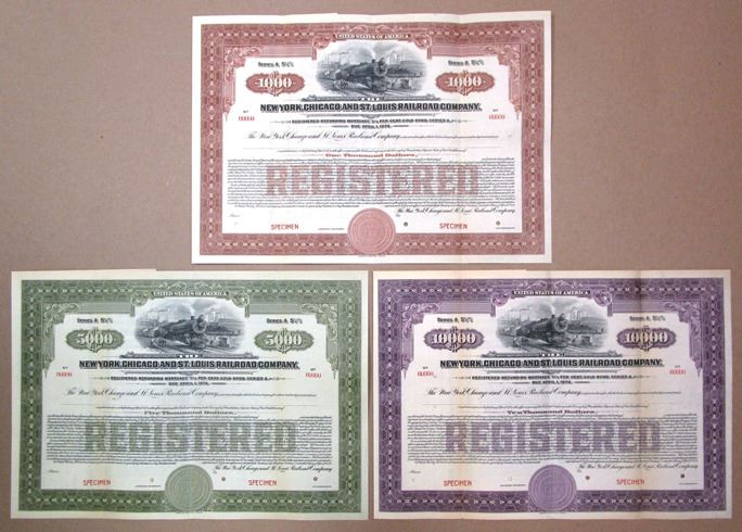 New York, Pennsylvania, Ohio & Indiana, 1924. Lot of 3 Registered Refunding Mortgage 5 1/2% Series A Specimen Gold Bonds in different colors and denominations, includes: $1000 in Brown, $5000 in Green, and $10,000 in Purple. All have same vignette at top, Specimen overprints and POCs, are in XF+ condition, ABNC. (3). Sold "AS IS" no returns accepted. All from unlisted Series A and unlisted design.