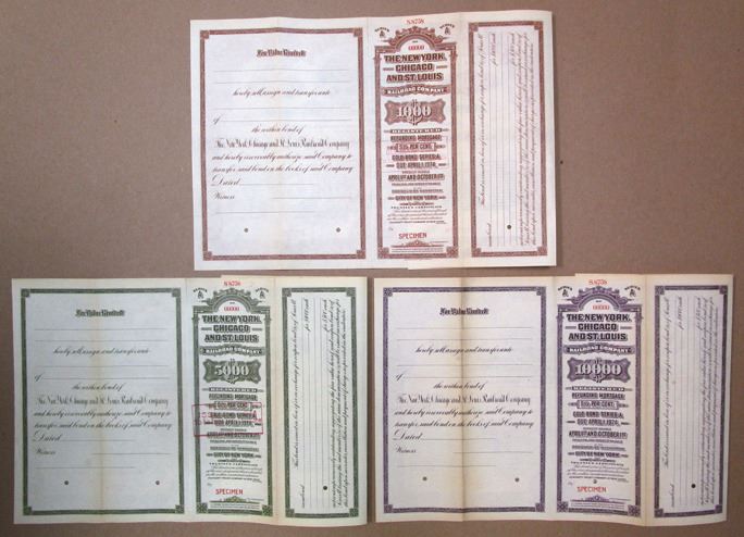 New York, Pennsylvania, Ohio & Indiana, 1924. Lot of 3 Registered Refunding Mortgage 5 1/2% Series A Specimen Gold Bonds in different colors and denominations, includes: $1000 in Brown, $5000 in Green, and $10,000 in Purple. All have same vignette at top, Specimen overprints and POCs, are in XF+ condition, ABNC. (3). Sold "AS IS" no returns accepted. All from unlisted Series A and unlisted design.