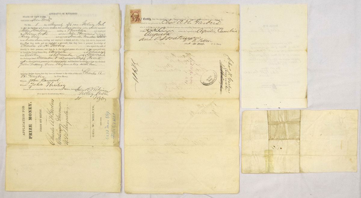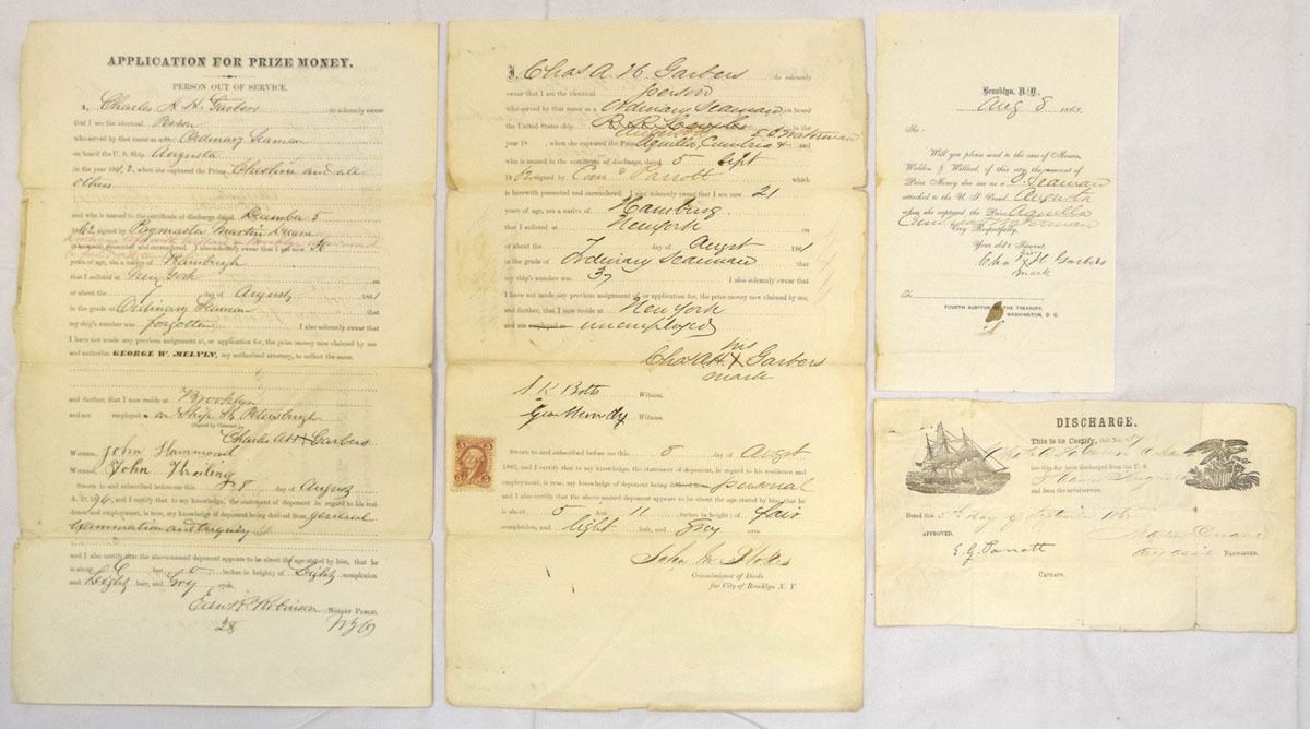 New York, 1862-63. Lot of 4 pieces, Includes: September, 5, 1862, Discharge certificate for Charles A. H. Garbers, showing that he has been discharged from the U.S. Steamer "Augusta" and from naval service; Brooklyn, NY. August 8, 1863, Paperwork asserting that Garbers was an ordinary seaman on board the Augusta steamship when it captured the "Prize" ships the Aquila and Cambria, presumably enemy ships while he was a seaman on the Augusta; New York, 1876, Application for Prize Money for a Person Out of Service, stating that while Garbers was serving on the "Augusta" prize ships were captured, and he is entitled to a share of the prize money occurring from the capture of said ships on document witnessed by 2 of Garbers shipmates. The lot also includes an additional document calling for the payment of prize money dated August 8th, 1863 that was owed to Charles A. H. Garbers. All are in fine to VF condition with some archival reinforcement of light splitting along fold lines and other signs of wear. A significant artifact of the American Civil War. Scarce with so many additional supporting documents, all related to the same application and retired seaman. The second USS Augusta was a side-wheel steamer in the United States Navy during the American Civil War. She was named for the city of Augusta, Georgia. The prize ships mentioned in this lot are the Aquila, Cambria, and E. J. Waterman. (3)