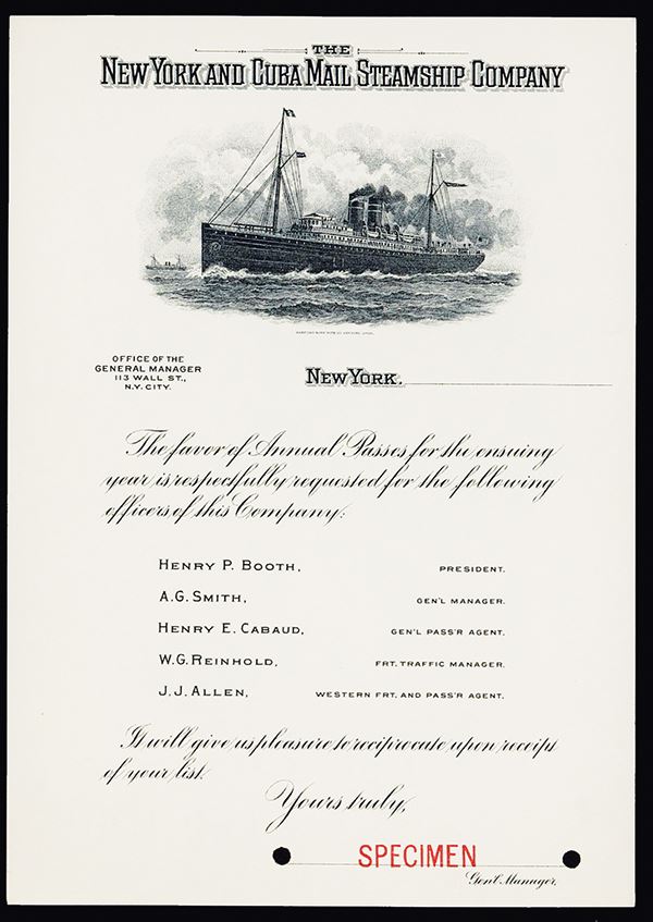 New York & Cuba Mail Steamship Co. Litho steamship and letter request for complimentary passes for company officers. POC. Specimen.
