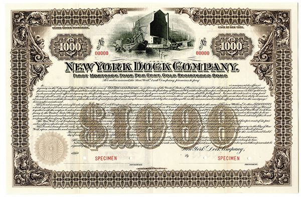 New York, 1901, $1000, 1st Mortgage 4 % Gold Registered Specimen Bond, Horizontal format, Ship and moving locomotive at dock top center, POC'S, VF-XF condition, FLBNC.