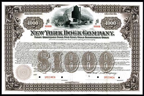 New York, 1901, $1000, 1st Mortgage 4 % Gold Registered Specimen Bond, Horizontal format, Ship and moving locomotive at dock top center, POC'S, VF-XF condition, FLBNC.