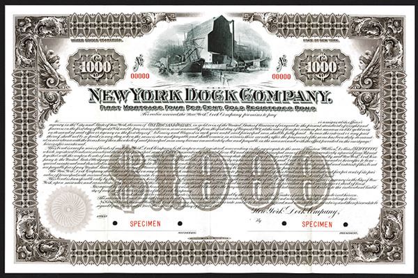 New York, 1901, $1000, 1st Mortgage 4 % Gold Registered Specimen Bond, Horizontal format, Ship and moving locomotive at dock top center, POC'S, VF-XF condition, FLBNC.