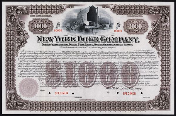 New York, NY, 1901, $1000, 1st Mortgage 4% Gold Registered Specimen Bond. Ship and train at dock with warehouse behind, Brown border and underprint, Specimen overprints, POC's, XF condition. Franklin-Lee BNC. The NY Dock Company owned 2 1/2 miles of Brooklyn waterfront at the turn of the 20th century. The company operated from 1900 until 1955. Rare initial bond offering from this important New York waterfront company.