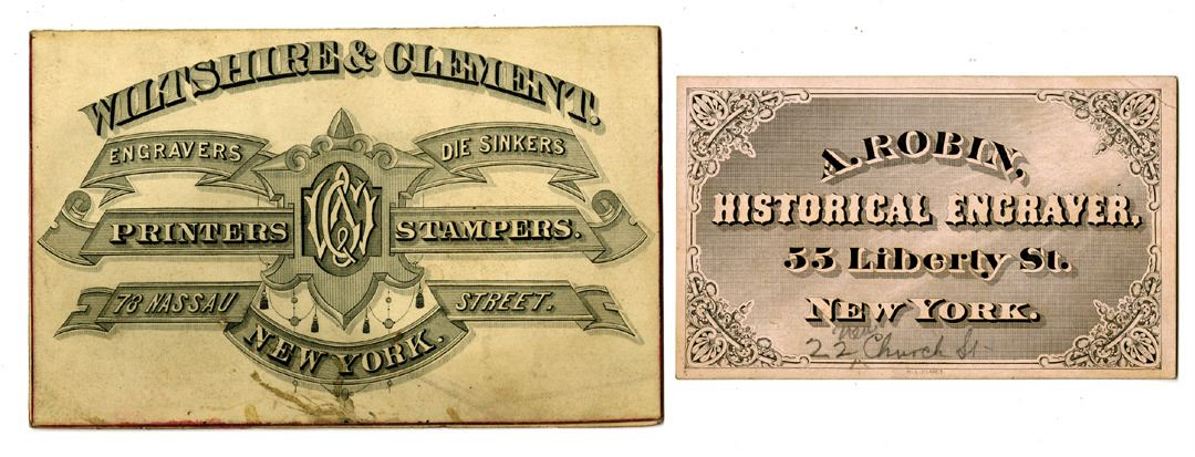 New York, NY. Lot of 2 intaglio printed business cards, Includes: A. Robin, Historical Engraver, located at 55 Liberty Street, NY, black printing on pink card; and, Wiltshire & Clement, Engravers, Die Sinkers, Printers and Stampers, located at 76 Nassau Street, NY, black printing printed on thick card. Both in XF with either stains or very small problems, still scarce if not rare printer and engraver business cards. (2)