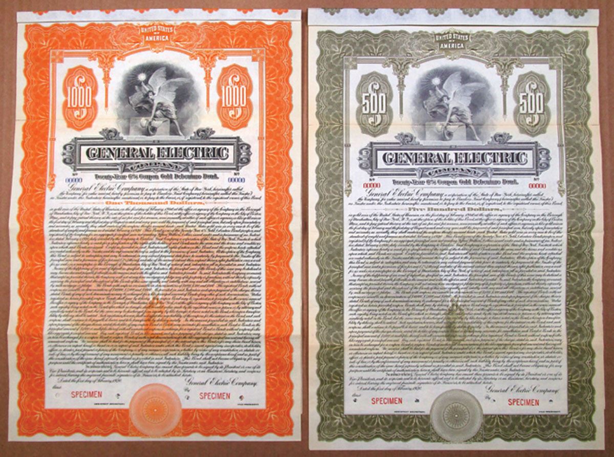 New York, 1920. $500 and $1000 Specimen 6% Debenture Gold Coupon Bonds with Orange border and Olive border, Both have allegorical vignette of angel with lantern, middle of bond has an early light bulb undertint, Specimen overprints, POCs, VF to XF condition, printed by ABNC. (2). Sold "AS IS" no returns accepted.