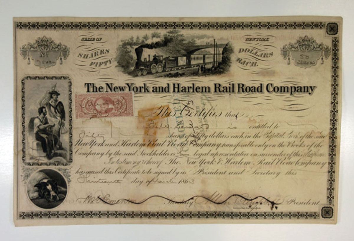 New York & Harlem Rail Road Co., 1863 50 Shrs I/C Capital Stock Cert., 25 Cent Adhesive Part Perf "Certificate" stamp, Locomotive under bridge at top with sailor and worker at left with resting dog at bottom, Fine-VF with toning. Signed by F.W. Seward, son of United States Secretary of State William H. Seward, he served as Assistant Secretary from 1861 to 1869 under both Abraham Lincoln and Andrew Johnson and then from 1877 to 1879 in the administration of Rutherford B. Hayes. On February 21, 1861, Seward arrived at the Continental Hotel in Philadelphia carrying a letter from his father for President-elect Lincoln. The letter contained information gathered by Colonel Charles Pomeroy Stone and General Winfield Scott. Stone had stationed three detectives from the New York police department in Baltimore, Maryland to gather information about plots against Lincoln. Making his way by train from Illinois to Washington for his inauguration, Lincoln had intended to stop next at Baltimore, which was home to many secessionist sympathizers. According to information gathered by Stone's detectives, secessionists were planning to assassinate Lincoln during his stop in Baltimore. When his father was appointed Secretary of State in 1861, Seward became Assistant Secretary of State in charge of consular service under Lincoln and Andrew Johnson. He served in the position until 1869 and "assisted in the negotiations to the adoption of the Burlingame Treaty," which set the attitude towards China when the empire "accepted the principles of international law." On April 14, 1865, he was injured in an assassination attempt upon his father on the same night that Lincoln was murdered. Lewis Powell, also known as "Lewis Paine," an ex-Confederate co-conspirator of John Wilkes Booth attempted to kill William Seward while the Secretary of State was convalescing at home from a carriage accident. After Frederick blocked Powell from gaining access to William Seward's bedroom, Powell tried to shoot Frederick in the head. However, when the gun failed to fire, Powell quickly smashed the pistol over Frederick's head, causing several skull injuries. Frederick then collapsed and fell to the floor at the top of the stairs. Powell then burst into William Seward's room and stabbed him several times in the face and neck. Powell also injured a number of other bystanders, including Frederick's sister Fanny, his brother Augustus, his father's nurse Private George F. Robinson and messenger Emerick Hansell, but no one was killed. Seward's mother was sure that he was going to die; instead, she died on June 21, 1865 of a heart attack. His sister, Fanny, died soon afterward, in October 1866. Powell was hanged on July 7, 1865, along with David Herold, George Atzerodt, and Mary Surratt, who were also involved in the conspiracy.