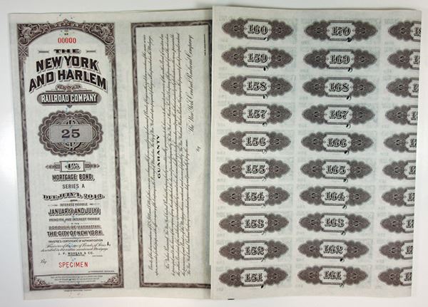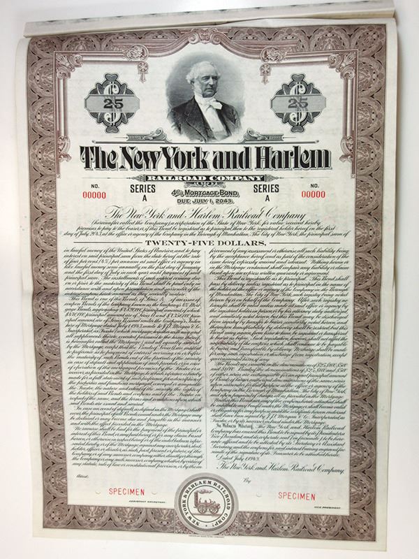 New York. $25 Specimen 4% Series A Mortgage Bond, Black print on brown border and under tint, Portrait of Cornelius Vanderbilt at top, Specimen overprints and POC's, VF-XF condition, ABNC.