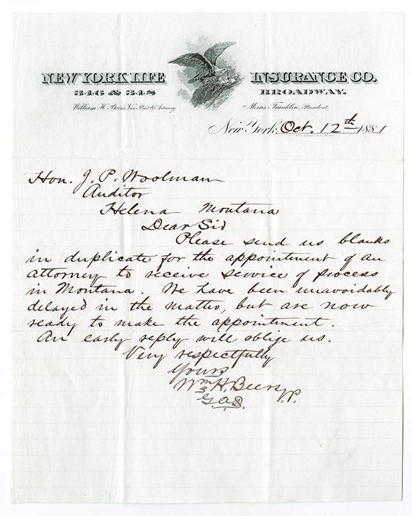 Montana and New York. Letter head and letter, eagle feeding young on top, letter discusses insurance business. VF condition.