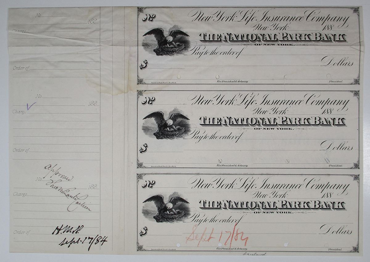 New York, 1884. Uncut Proof Sheet of 5 checks, Black text with black border, Eagle with chicks at left, POCs, Approval initials at bottom. Fine condition with usual folds from archival storage, ABNC.