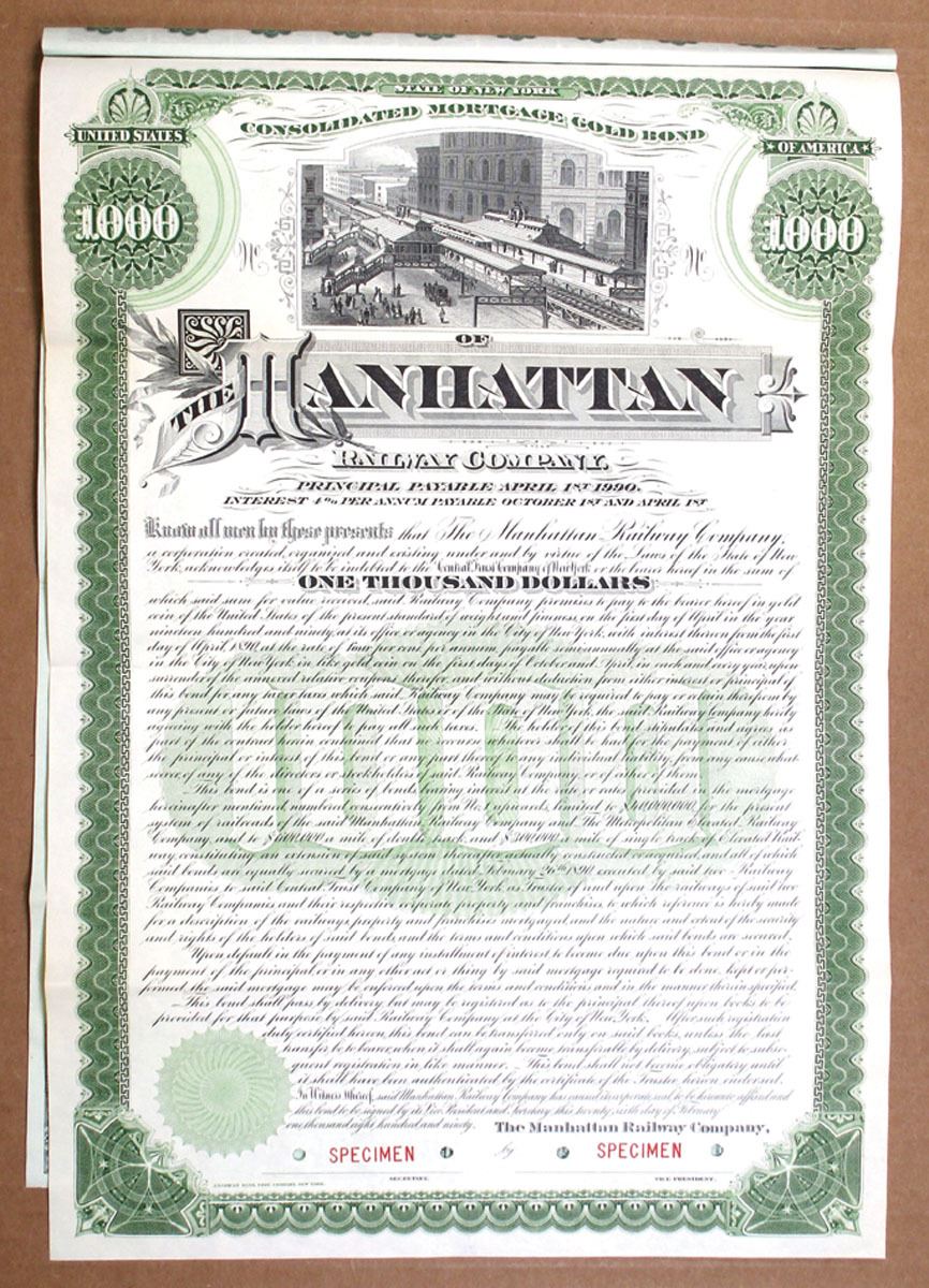 New York, 1890. $1000 Specimen 4% Consolidated Mortgage Gold Coupon Bond, Black on green border and underprint, View of above ground railroad on busy street over ornate title, Specimen overprints and POCs, VF to XF condition. ABNC.