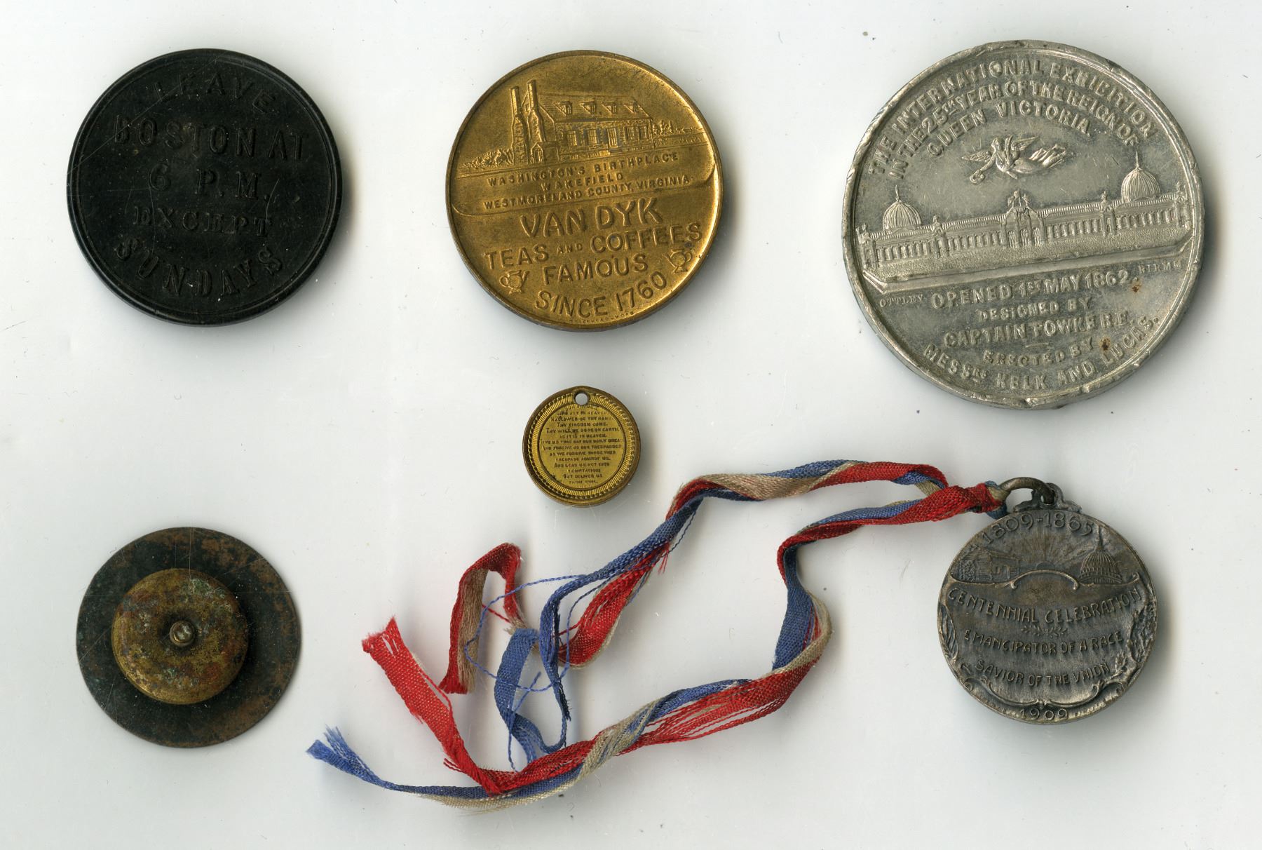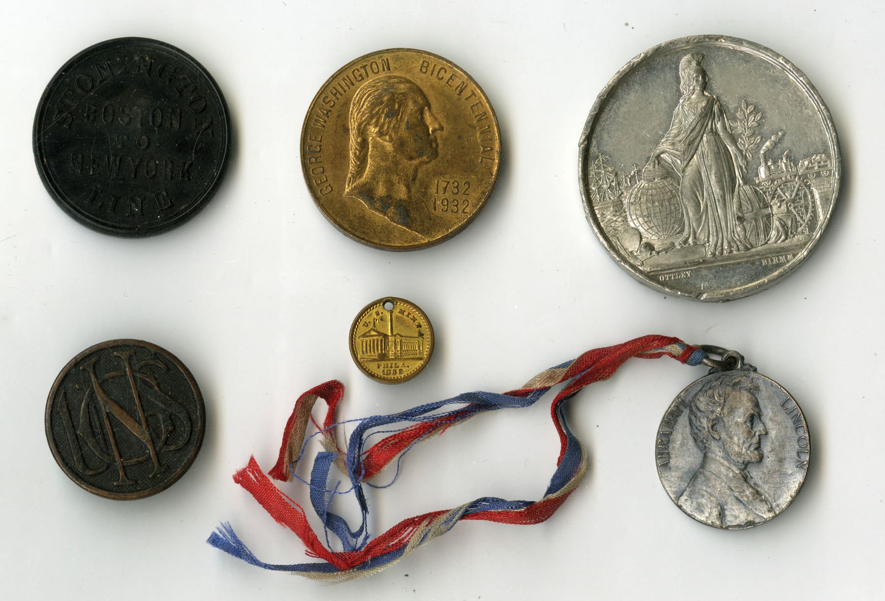 Various Locations, Lot of 6 items, ca.1870 to 1932, Includes 1932, Washington Bicentennial bronze medal with Van Dyk Teas and Coffees ad on back, Washington's portrait on obverse; 1909, Lincoln medal from the Centennial Expo of 1976 with ribbon; ca.1880-1900 Stonington Line Railroad Plastic circular pass - Boston to New York; a bronze or copper button with USNG initials (U.S. National Guard?); 1860-80s(?difficult to read) U.S. Mint medal, 1/2 inch diameter with an image of the U.S. Mint building on 1 side and the Lords Prayer in microprinting on the other side; and, London, England, 38 mm, aluminum or white medal, 1852, International Expo medal with Brittania on one side and building on reverse, XF, bent. Overall, an interesting and useful assortment.