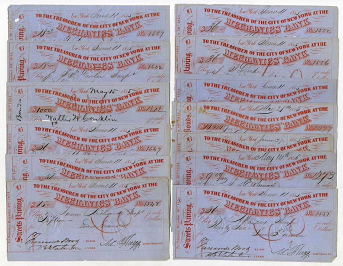New York, 1855. Lot of 13 I/C Checks for Various Denominations, Signed by of New York Fernando Wood, Fine to VF+ condition. Fernando Wood (February 14, 1812 _ February 13, 1881) was an American Democratic Party politician, merchant, and real estate investor who served as the 73rd and 75th Mayor of New York City. He also represented the city for several terms in the United States House of Representatives and was a Southern sympathizer during the Civil War. (13).