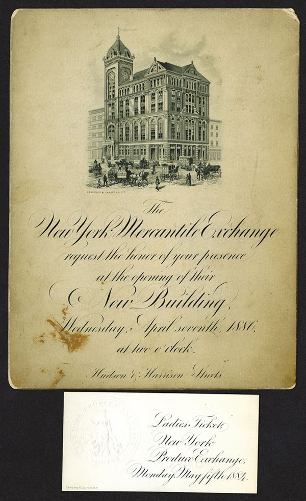 Invitation for opening of New York Mercantile Exchange, 1886 Building view on heavy card stock. Dark tone and stain. Ladies ticket for produce Exchange. 1884 Includes a blind embossed seal. Both with imprint of Dempsey & Carroll, NY. 2 pieces.