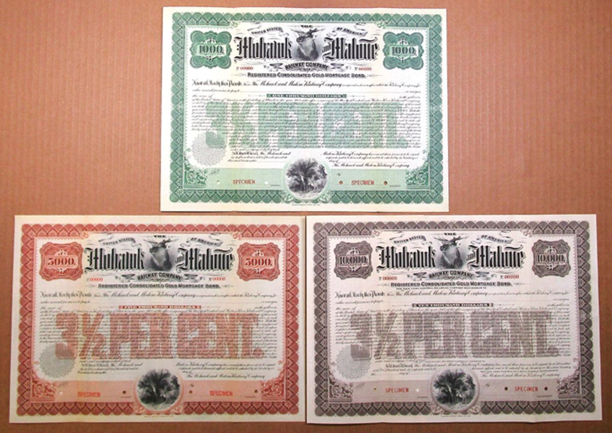 New York, 1904. Lot of 3 Registered 3 1/2% Specimen Bonds, Includes: $1000 with Green border; $5000 with Light Brown border; $10,000 with Dark Brown border. All bonds have same Buck vignette at top and bottom, Specimen overprints and POCs, are in VF to XF condition, and printed by ABNC. (3). Sold "AS IS" no returns accepted.