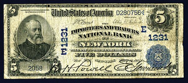 The Importers and Traders National Bank of New York, NY, Lyons|Roberts. S/N 2058, Charter # 1231, note appears VG to Choice VG condition with the appearance of a lot of use, but intact margins, no pin holes, strong signatures and very attractive for the grade. There was 1 previous $5 Date Back reported before this one was found and is new to the census. This may be your only chance to own a $5 Date Back from this bank for many years.