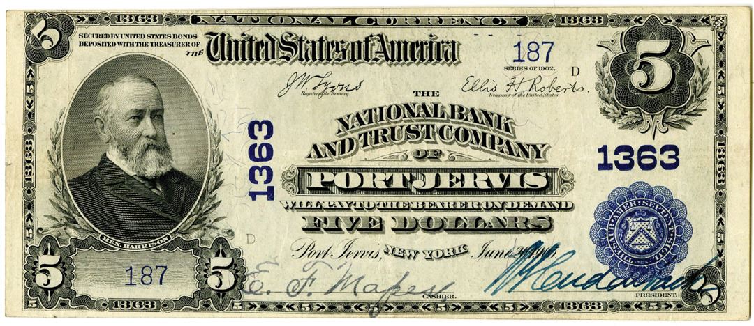 Port Jervis, NY. $5, Series of 1902 PB, Ch# 1363, S/N 187, Choice VF to XF or better.