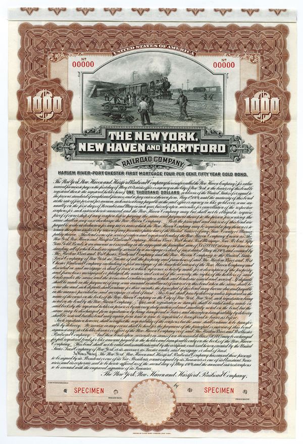 CT., MA., R.I.. $10,000 Specimen 4% Harlem River Port Chester 1st Mortgage Gold Coupon Bond, Black print on large brown border and under tint, Image of locomotive in foreground and men working on tracks. Specimen overprints and POC's, VF-XF condition, ABNC. Railroad is listed on Cox, but Unlisted Bond type.