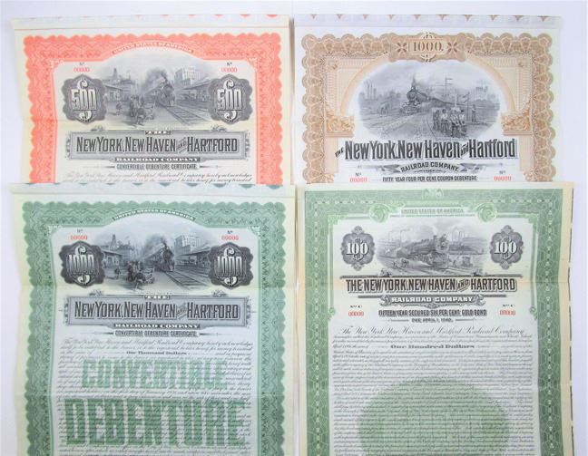 Connecticut, Massachusetts, & Rhode Island, 1906-25. Lot of 4 Specimen Bonds, Includes: 1906, $500, 3 1/2% Convertible Debenture Coupon Bond with an Orange border and underprint, The $500 is an unlisted denomination from the 1906 series, First time seen and rare; 1906, $1000, 3 1/2% Convertible Debenture Coupon Bond with a Green border and underprint, Only known as a specimen, no issued examples known; 1906, $1000, 4% Fifty Year Debenture Coupon Bond with a Light Brown border and underprint, Only known as a specimen, no issued examples known; and, 1925, $100, 6% Fifteen Year Secured Gold Coupon Bond with a Green border, scarce as a specimen. All have Specimen overprints, POCs, and are in Fine-VF condition. ABNC. (4). Sold "AS IS" no returns accepted.