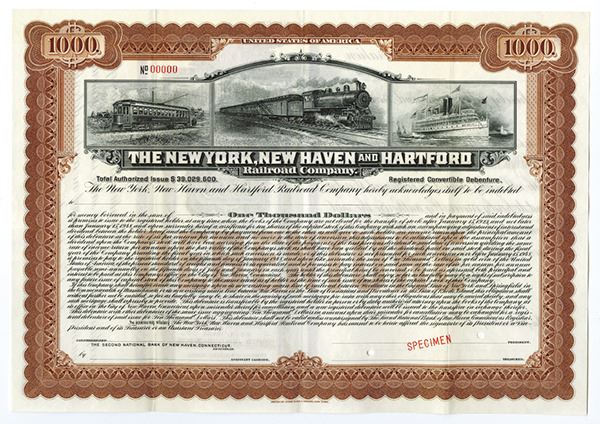CT., MA., R.I.. $1000 Specimen 6% Registered Convertible Debenture Bond, Black print on brown border and under tint in horizontal format, Multiple image on certificate; a locomotive at center an electric train to the left and a ship at the right, Specimen overprints and POC's, VF-XF condition, ABNC.