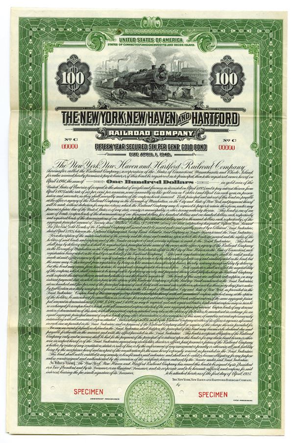 CT., MA., R.I.. $100 Specimen 6% Secured Gold Coupon Bond, Black print on green border and under tint, Image of long locomotive approaching in a yard with workers on the tracks to the left and rights, Specimen overprints and POC's, VF-XF condition, ABNC. Railroad is listed on Cox, but is an Unlisted as a specimen.
