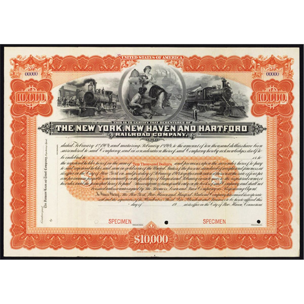Connecticut, 1904, $10,000, 4% Registered Gold Debenture Specimen, Black on orange border and underprint, Allegorical woman sitting top center with industry behind her flanked by two trains at stations, Coupons attached, VF-XF condition, American BNC.