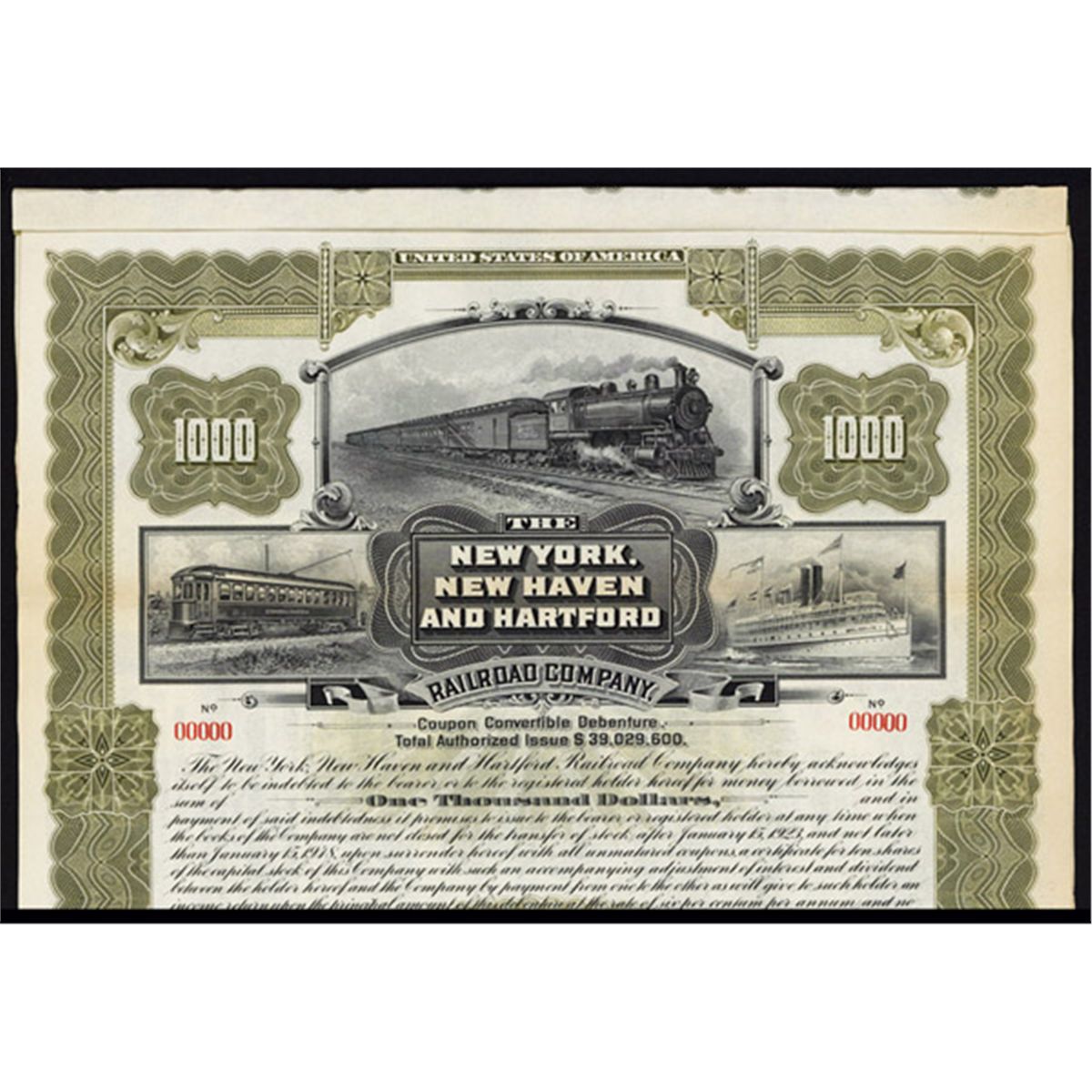 Connecticut, 1908, $1000, 6% Coupon Convertible Debenture, Specimen, Black on pea-green border and underprint, Moving train top center flanked underneath right by steamship and underneath left by trolley, Coupons attached, VF-XF condition, ABNC.