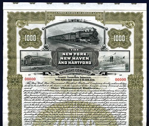 Connecticut, 1908, $1000, 6% Specimen Bond, Vertical format, Coupons attached, locomotive top center l-r with electric trolley on left and oceanliner on right, VF-XF condition, ABNC. Listed railroad unlisted bond in Cox.