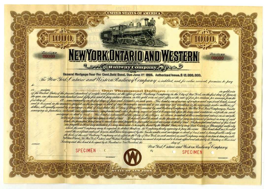 New York, 1905. $1000 Specimen 4% Registered General Mortgage Gold Bond, Black text with brown border and underprint, Profile of train passing by at top center. Red specimen overprints, 00000 serial numbers, POCs. Fine-VF condition, ABNC.