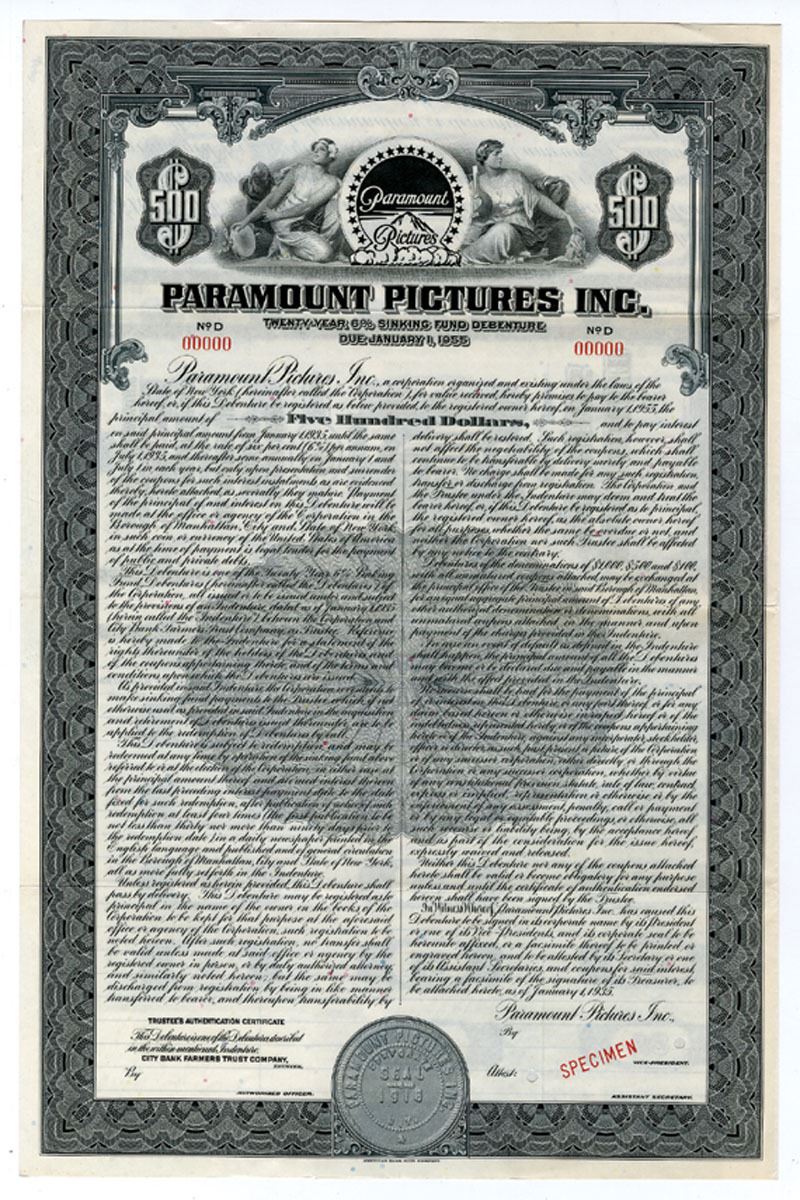 New York, 1935. $500 Specimen 6% Sinking Fund Debenture Coupon Bond, Black print on steel gray border and underprint, Allegorical women at top flanking famous Paramount Logo - a mountain ringed with stars, Specimen overprint and POC, XF to AU condition, ABNC.