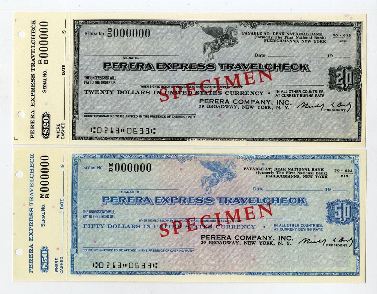 New York, ND (1950-60s). $20 and $50 Specimen Travelers Checks, Both have Specimen overprints, are in UNC to Gem UNC condition, and printed by S-CBNC. Perera Express Company, established by Perera Company, Inc., was primarily involved in the issuance and redemption of travelerÕs checks, with operations beginning in 1964 under its trademark, which expired in 1992. The company also provided currency-related travel services, as evidenced by promotional materials from the late 1950s. While its original focus was financial services for travelers, the name "Perera Express" has since been associated with other businesses, including a Japan-based company and a cargo and freight service known as Perera Super Express. (2). Sold "AS IS" no returns accepted.