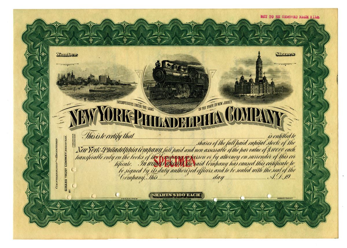 New Jersey, 19--(ca. 1900-1920). Specimen. Odd Shares, Capital Stock, Green border. Vignette of speeding locomotive in middle, NY harbor on left and Philadelphia City Hall on right. XF with light toning. SBNC. Rare stock certificate.