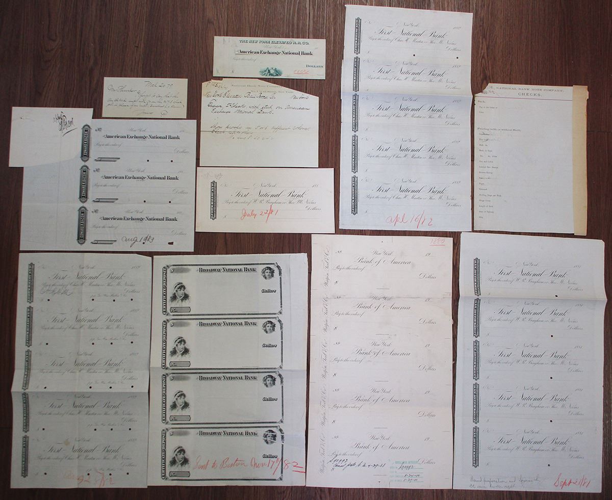 New York. Lot includes over 10 items, highlights include: American Exchange National Bank 1880s Uncut Proof Check Trio with approval initials; Broadway National Bank 1882 Proof Uncut Check Quartet with note at bottom, ABNC; First National Bank 1882 Proof Uncut Check quintet with approval initials; and a National Bank Note Co. handwritten check order from, ca. 1880s. Over 10 pieces total.
