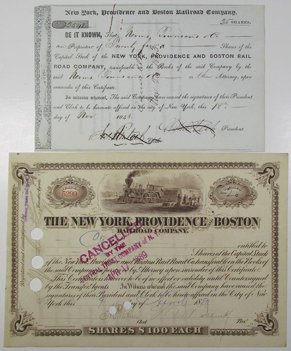 Massachusetts, 2 pieces, both from New York, Providence and Boston Railroad Company: 1889 20 Shares I/C Capital Stock Certificate, Black text with brown border; 1843 25 Shares I/C Capital Stock Certificate, Black and white. 2 pieces.