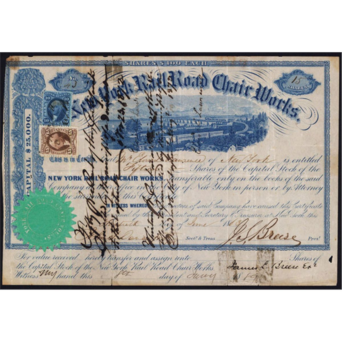 New York, 1863, 15 Shares, Issued and uncancelled but there is ink endorsements on the face, printed in blue with large vignette of locomotive around curve with locomotive on bridge in background, green paper seal, Cert.#43,Choice VG to Fine condition with a small hole on the bottom left margin, rare railroad related stock certificate.