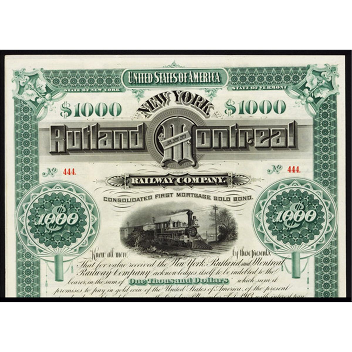 New York & Vermont, 1884, $1000, Consolidated 1st Mortgage Gold Bond, Issued and uncancelled Bond, Black on green border and underprint, Locomotive passing telegraph lines at center under ornate title, Coupons attached, VF-XF condition, ABNC.