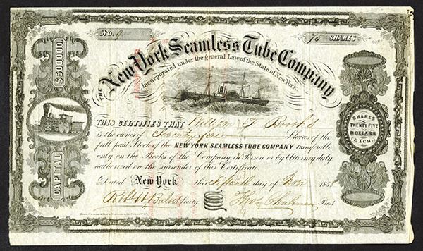 New York, Nov. 15th, 1858, 75 Shares, Issued and Uncancelled, Black with no underprint, Steamship in middle under curved title, locomotive at left, curved tube at bottom middle, yellow seal on lower right, S/N 9, Fine condition, evidently used in boiler and steam engine manufacturing, rare and very attractive certificate. From a new estate find.