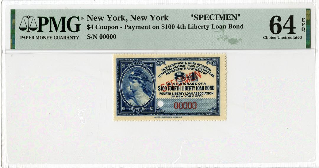 New York, ND. $4, Specimen, Fourth Liberty Loan Association of New York City, Blue print with Specimen overprint and POC's. Liberty facing left on left side of coupon, Gummed on the back, approximately 2.5 x 1.5 inches, PMG graded Choice Uncirculated 64 EPQ. These coupons allowed people to purchase U.S. Liberty Loan Bonds on an installment basis. BNC.