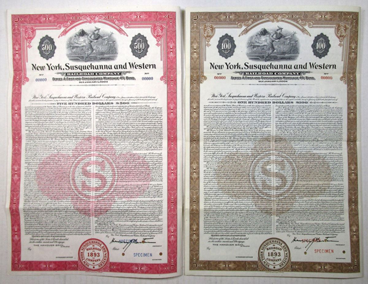 New Jersey, 1953. $100 and $500 Pair of 4% First and Consolidated Mortgage Series A Coupon Bonds in Brown and Red. Both have Specimen overprints, POCs, are in VF to XF condition, and printed by ABNC. (2). Sold "AS IS" no returns accepted. The New York, Susquehanna and Western Railroad (NYS&W), founded in 1881, initially focused on transporting anthracite coal across New York, New Jersey, and Pennsylvania. Over time, it expanded into passenger and general freight services. Despite facing financial challenges, the railroad survived and was revitalized in the 1980s, shifting its focus to intermodal and freight transport. Today, it remains an important regional freight carrier.