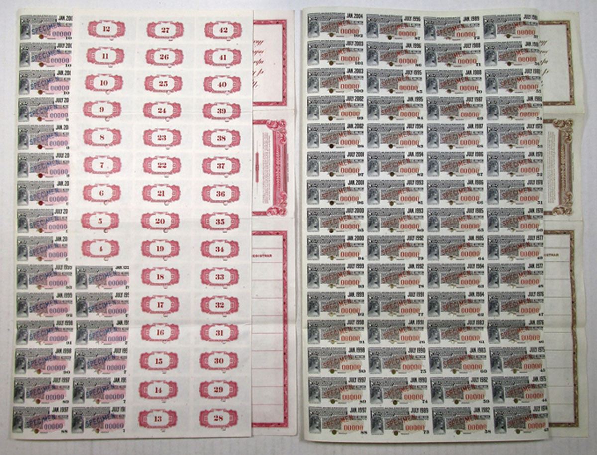 New Jersey, 1953. $100 and $500 Pair of 4% First and Consolidated Mortgage Series A Coupon Bonds in Brown and Red. Both have Specimen overprints, POCs, are in VF to XF condition, and printed by ABNC. (2). Sold "AS IS" no returns accepted. The New York, Susquehanna and Western Railroad (NYS&W), founded in 1881, initially focused on transporting anthracite coal across New York, New Jersey, and Pennsylvania. Over time, it expanded into passenger and general freight services. Despite facing financial challenges, the railroad survived and was revitalized in the 1980s, shifting its focus to intermodal and freight transport. Today, it remains an important regional freight carrier.