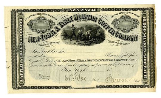 Calaveras County, California. (Inc. in New York). Odd Shares, Capital Stock Specimen Certificate, Black print on simple black border, Men mining at top with waterfall in distance, VF-XF condition with minor damage to right side margin, Hand written Specimen. Continental BNC.