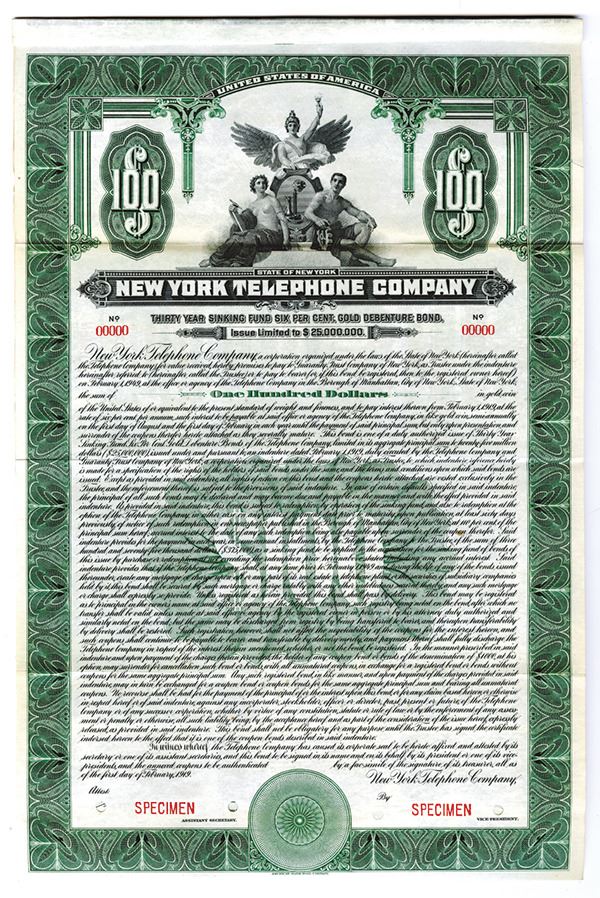 New York. $100 Specimen 6% Sinking Fund Gold Debenture Coupon Bond, Black print on green border and under tint, Group of allegorical figures surrounding telephone at top, Specimen overprints and POC's, VF-XF condition, ABNC. Company was founded in 1896 after taking over the New York City operation of the Bell Telephone Co. and what would eventually become Verizon.