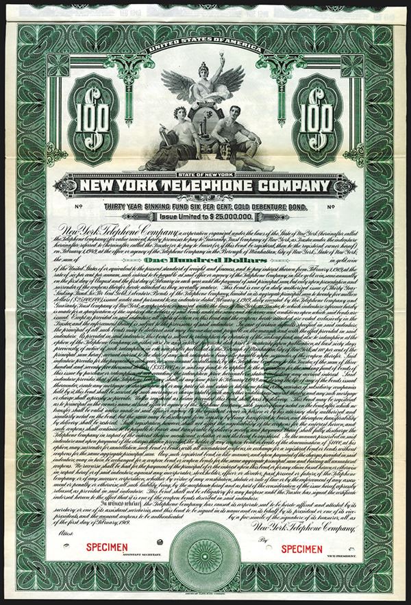 New York, 1919, $100 Specimen 6% Gold Bond. Allegorical women and men flank old fashioned telephone. POC. Coupons attached. XF Condition. ABNC. Rare and early NY Telephone specimen.