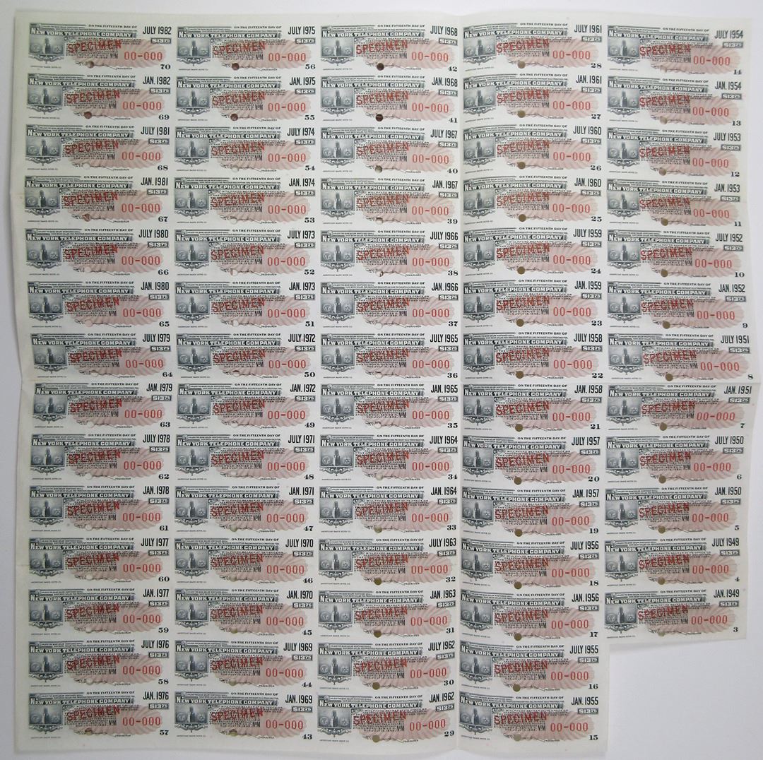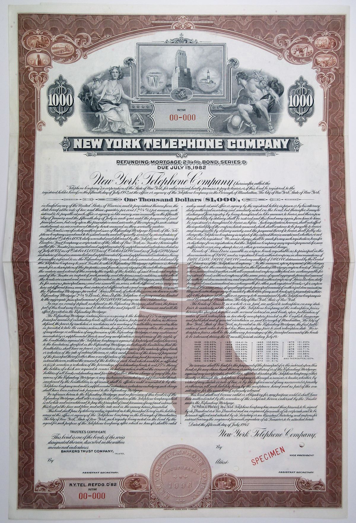 New York, 1947. $1000 Specimen 2.75% Refunding Mortgage Coupon Bond, Black text with brown border and undertint, Allegorical figures flank large build in rectangular frame at top center. Red specimen overprints, 00-000 serial numbers, and POCs. VF condition, ABNC. The New York Telephone Company (NYTel) was organized in 1896, taking over the New York City operations of the American Bell Telephone Company.