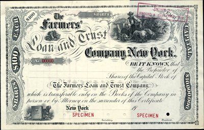 19--, ca.1900-1910. Odd Shs. Specimen stock certificate. Black border. Vignette of man feeding pigs with dog and safe on bottom. Red specimen overprints, POC's and "00000" serial numbers. XF condition. Scarce bank. Printer not listed but appears to be ABNC.
