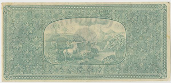 New York, 100 Denomination, Centaurs at bottom left and bottom middle, "White Liniment" for family use and "Yellow" liniment for horses, guaranteed to relieve pain, subdue inflammation and heal wounds, back green with centaurs and volcanos in middle, boxes on right with companies distributing the product. XF condition, Major & Knapp, NYC, Printers.
