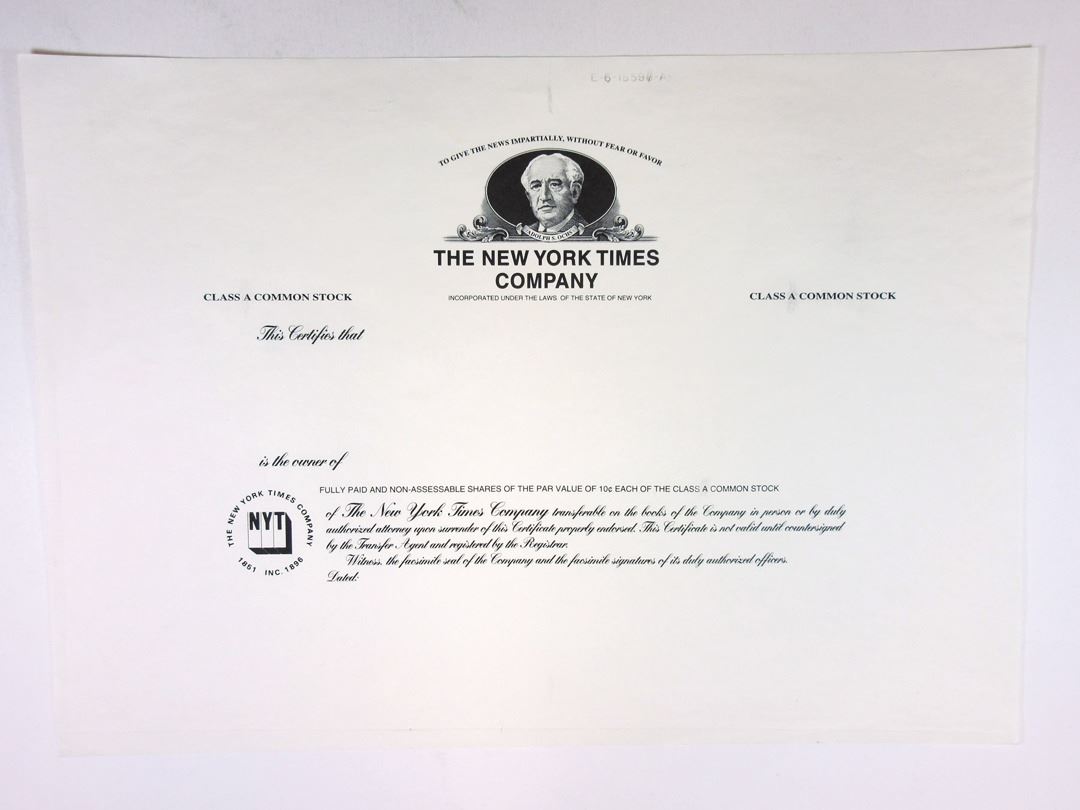New York, ND (1970-80's). Odd Shares Progress Proof Class A Stock Certificate, Black text on white paper, Adolph S. Ochs portrait at top center. Wide margins. VF condition. Missing border and underprint, The New York Times is an American daily newspaper based in New York City with a worldwide readership. Founded in 1851, the Times has since won 130 Pulitzer Prizes, and has long been regarded within the industry as a national "newspaper of record". It is ranked 18th in the world by circulation and 3rd in the U.S.