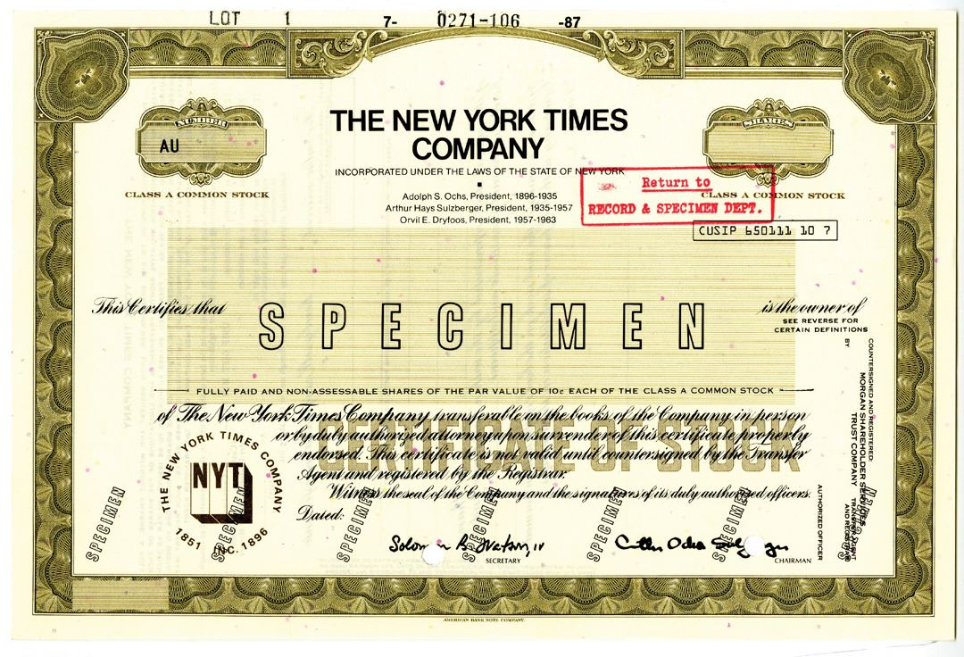 New York, 1987. Odd Shares Specimen Class A Stock Certificate, Black text with olive border and underprint. Return to Record & Specimen Dept. stamp at top right corner. VF condition, ABNC.