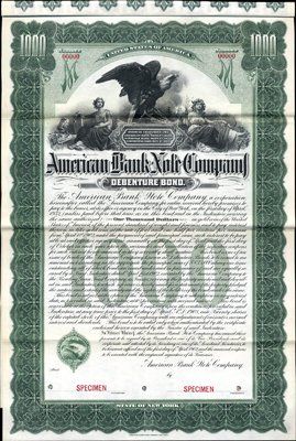 1902. $1,000. Specimen Bond. Green border. Allegorical women flank eagle. XF condition. Red "Specimen" overprints, "00000" serial numbers and POC's. Extremely rare ABNC bond. 3 found in archives. Coupons attached.. ABNC.